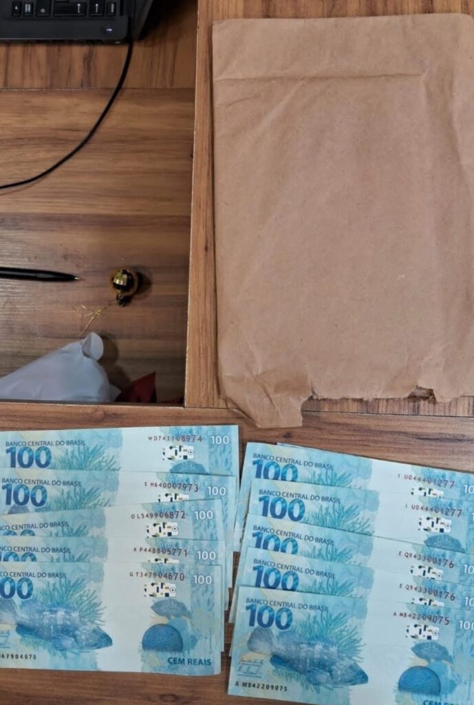 O valor estava dividido em dez cédulas de R$ 100,00. As notas permaneciam escondidas no interior de uma revista de passatempos do tipo “caça-palavras”, estratégia usada para tentar burlar a fiscalização postal e dificultar a identificação do conteúdo ilícito.